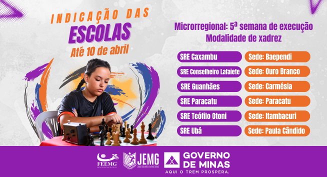 Fique atento! Termina dia 10 de abril, sexta-feira, o prazo para a indicação das escolas, a inscrição e gerenciamento dos estudantes-atletas na modalidade de xadrez da quinta semana de execução, conforme publicado no Cronograma de Execução dos Jogos.