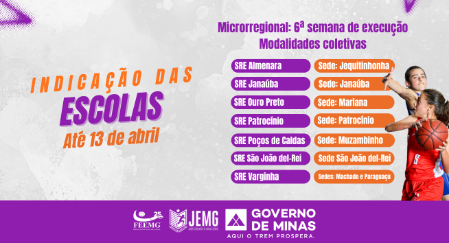 Confira a lista das SREs que fazem parte desta 6ª semana da etapa microrregional do JEMG/2026. É importante que todos os municípios pertencentes a essas superintendências realizem a indicação de suas escolas, garantindo a inscrição no sistema das instituições de ensino que representarão o município.