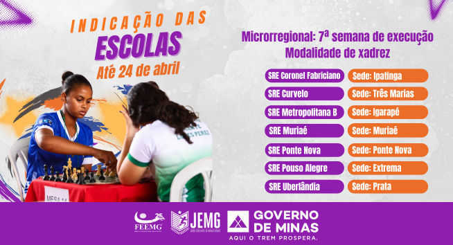 Fique atento! Termina dia 24 de abril, sexta-feira, o prazo para a indicação das escolas, a inscrição e gerenciamento dos estudantes-atletas na modalidade de xadrez da sétima semana de execução, conforme publicado no Cronograma de Execução dos Jogos.