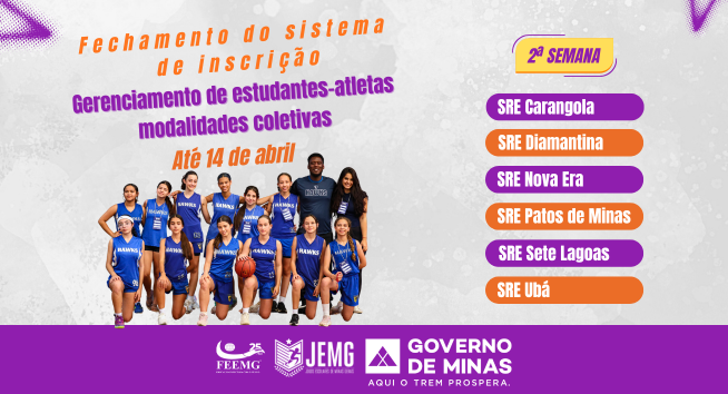 Confira a lista das SREs que fazem parte da primeira semana da etapa microrregional do JEMG/2026. É importante que todos as escolas pertencentes a essas superintendências realizem a inscrição e gerenciamento dos estudantes-atletas das modalidades coletivas.