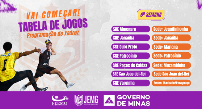 Já estão disponíveis os chaveamentos/emparceiramentos, tabelas de jogos e as programações de xadrez da 6ª semana de execução da etapa microrregional do JEMG/2026.