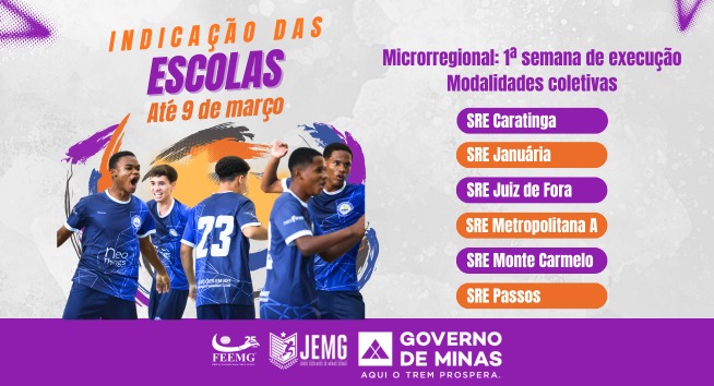 Confira a lista das SREs que fazem parte da primeira semana da etapa microrregional do JEMG 2026. É importante que todos os municípios pertencentes a essas superintendências realizem a indicação de suas escolas, garantindo a inscrição no sistema das instituições de ensino que representarão o município.