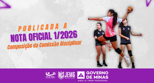 Já está disponível a Nota Oficial 1/2026. O documento trata da composição da Comissão Disciplinar do JEMG/2026. Acesse a aba Documentos/Notas Oficiais e confira a publicação.